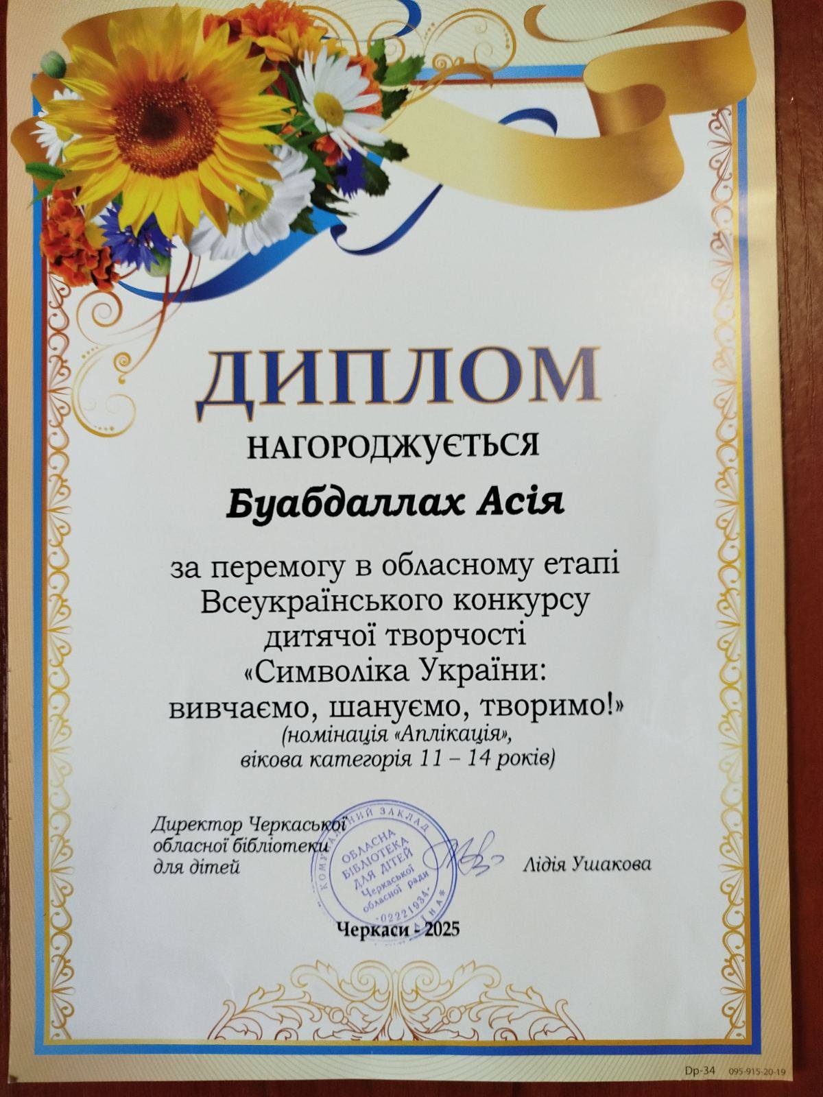 Зокрема, перше місце в номінації «Аплікація» у віковій категорії 11–14 років здобула 11-річна Асія Буабдаллах із села Легедзине Тальнівської громади.