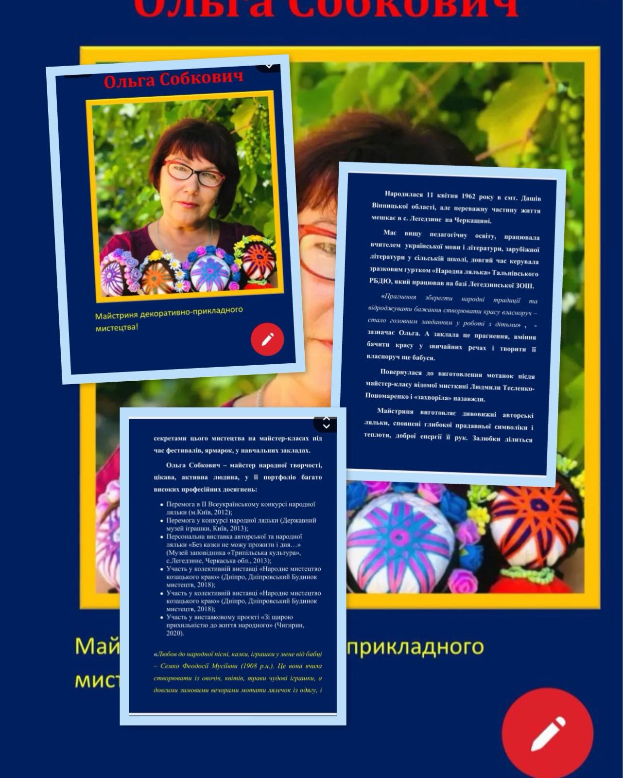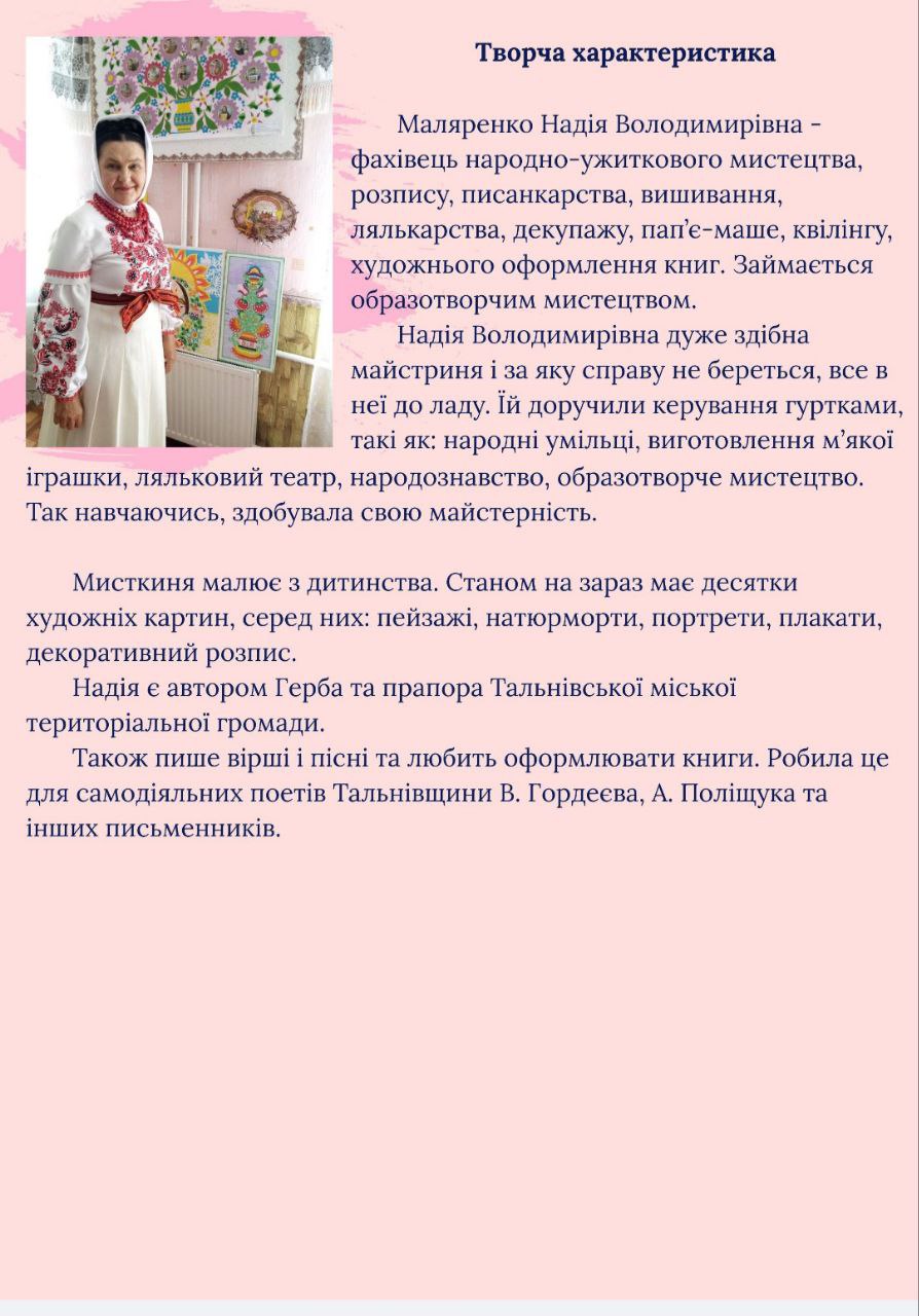 Серед них – Надія Маляренко, знана не лише в Тальному, а й за його межами. Саме вона є авторкою герба та прапора Тальнівської громади – символів, у яких закарбовано історію, силу та гідність краю. Пані Надія також займається писанкарством, вишивкою та створенням традиційних ляльок. Її роботи – це сплав давніх традицій, особистого стилю та щирої любові до рідного. У кожній писанці, в кожному стіжку, у кожній ляльці оживає глибока повага до предків та невтомне прагнення зберегти українську ідентичність.