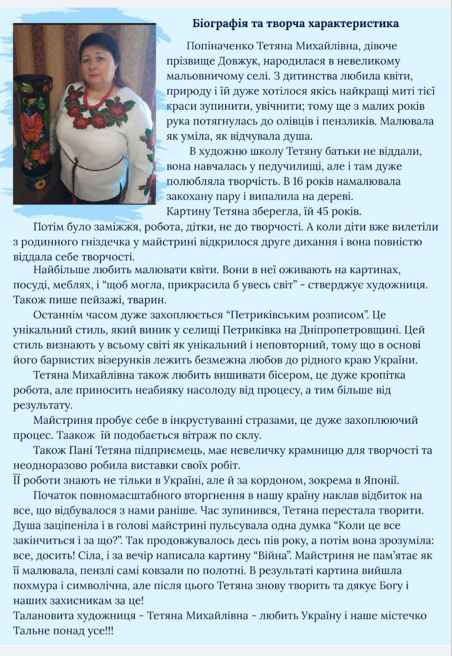 Третьою учасницею стала Тетяна Попіначенко – художниця-аматорка, яка працює в техніці петриківського розпису. Її барвисті квіти, птахи та орнаменти, виконані в найкращих традиціях українського декоративного мистецтва, вражають тонкістю ліній, гармонією кольорів та життєрадісною енергетикою. У її картинах – дух України, сонячної й щедрої, ніжної й сильної водночас.