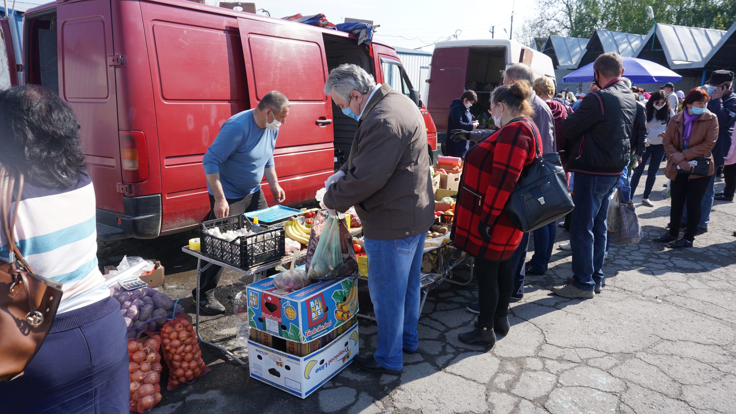 На ринковій площі торгових яток не так і багато. Овочівники торгують з мікроавтобусів, біля них скупчення людей, дистанції не дотримано. Деякі покупці у приспущеній масці, хтось зовсім зняв її. У продавців розсади – ажіотаж, люди «вилазять одне одному на плечі», про безпечну відстань у період пандемії вони, мабуть, не чули.
