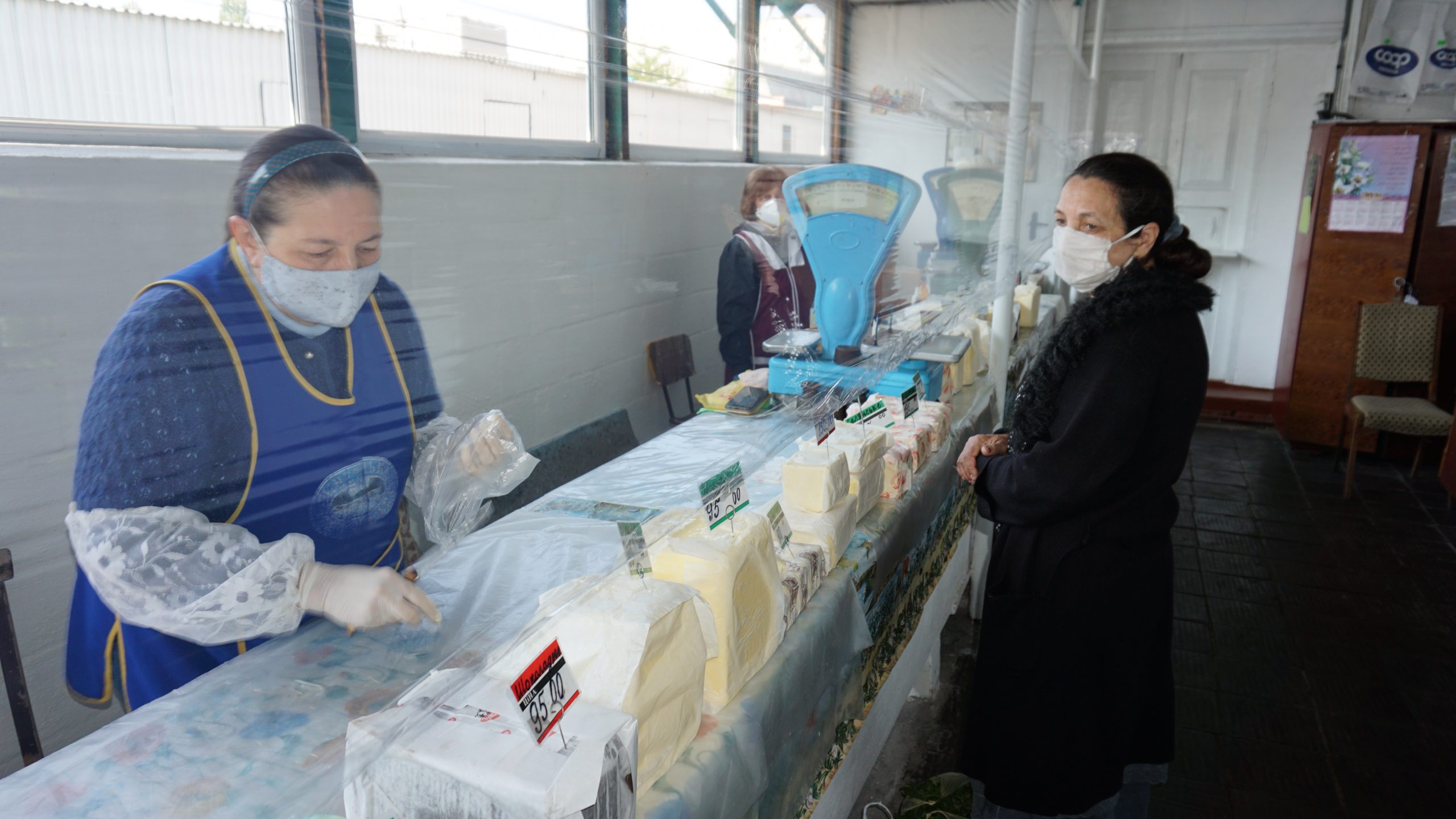 У м’ясо-молочному павільйоні порядок. Продавці з покупцями дотримують дистанцію, торгові прилавки з плівкою, торговці в рукавичках та з масками. Працюють у парі: один продає м’ясо, інший бере розрахунок. Проте покупців тут зовсім мало.