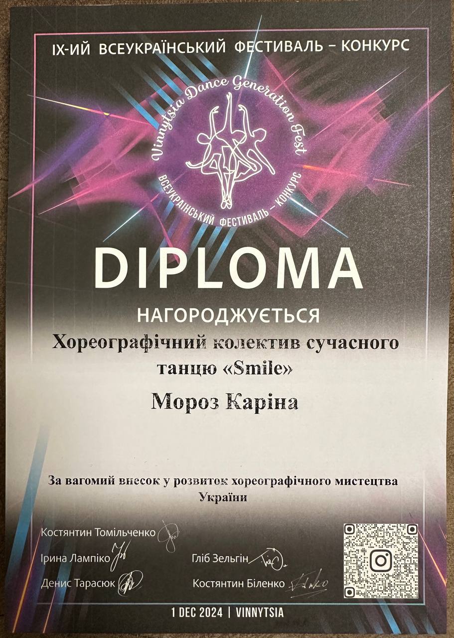 На фестивалі-конкурсі хореографічний колектив сучасного танцю «Smile» був нагороджений дипломом за вагомий внесок у розвиток хореографічного мистецтва України. Про враження від заходу розповіла його керівниця Каріна Мороз. Вона зазначила, що всі її вихованці здобули чотири призові місця, що стало заслуженою винагородою за їхню невтомну працю. «Кожен крок на сцені – це маленька перемога, за якою стоять роки наполегливих тренувань і безмежна любов до танцю», – підкреслила Каріна Юріївна.