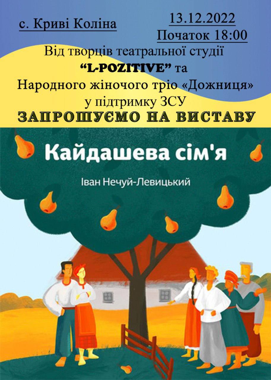 А саме, учасники студії та їх керівниця вирішили зробити інсценізацію «Кайдашевої сім’ї» Івана Нечуя-Левицького, яка відбудеться 13 грудня о 18:00 годині. Тобто вистава буде за мотивами повісті, але на погляд режисера внесуть певні зміни. Подія буде благодійною і в кінці вистави буде оголошена зібрана сума, яку в подальшому передадуть на потреби Збройних Сил України.