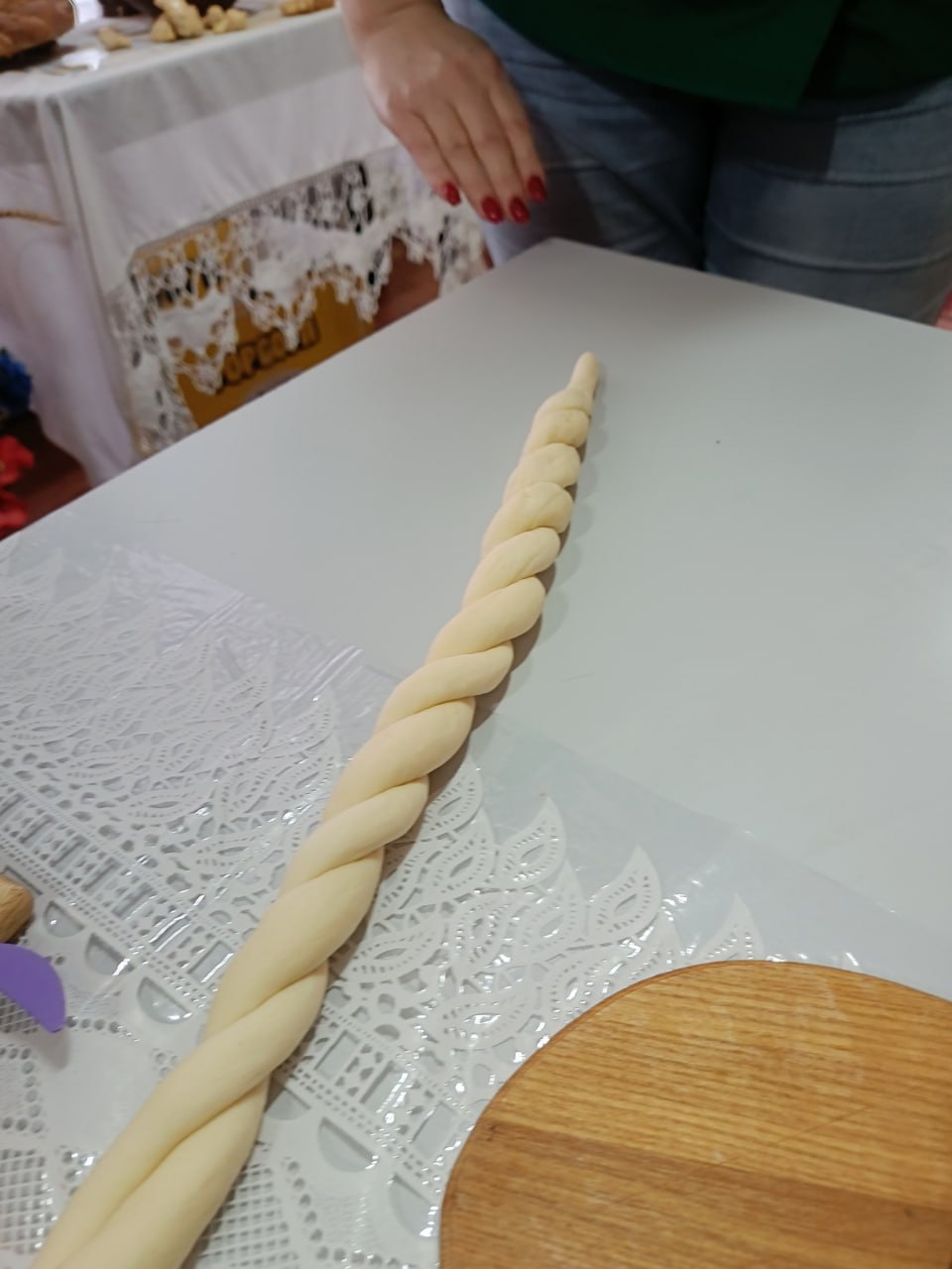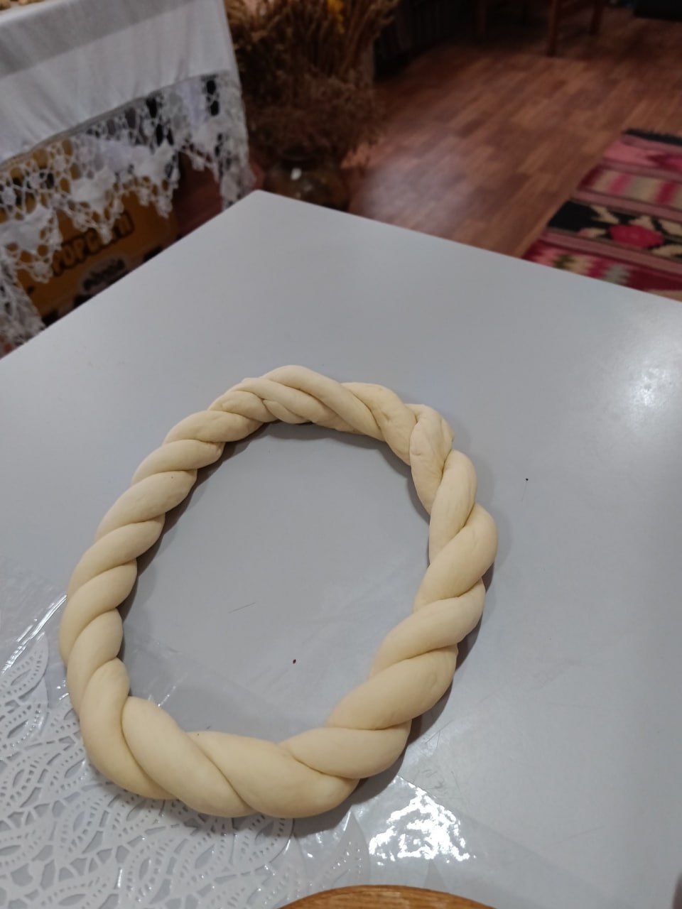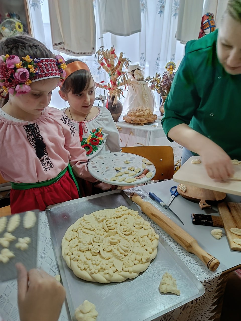 Пані Наталія взялася за роботу. Спочатку розмісила тістечко, виліпила основу, скрутила косичку. У класі панувала тиша. Дівчатка із захопленням дивились на руки, які майстерно вправлялися з пахучим місивом. Згодом пролунали запитання: як їй так легко все вдається і чи приносить ця праця задоволення. Господиня всміхнулася й пояснила, що любить випікати хліб і завжди приступає до роботи з чистими помислами.