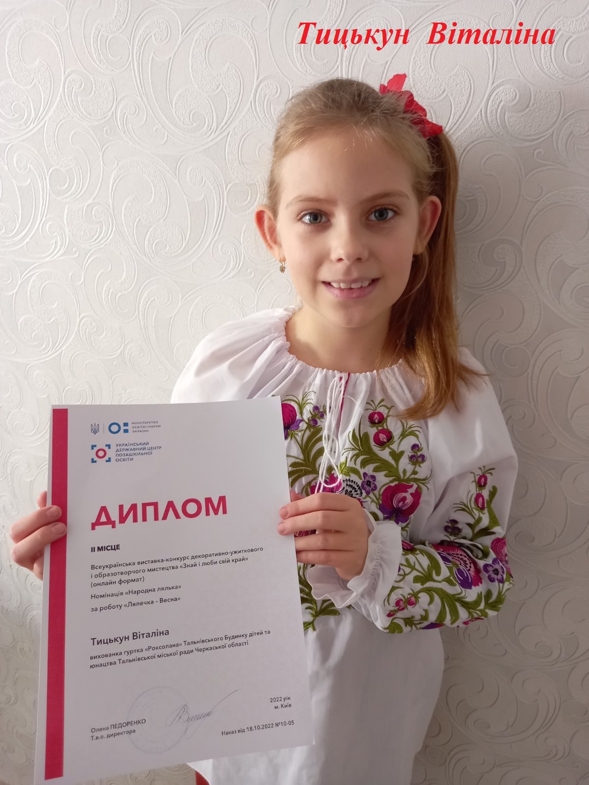 Зі слів керівниці Тальнівського Будинку дітей та юнацтва Тетяни Чмиги, друге місце у номінації «Лялька-мотанка» за роботу «Лялечка-Весна» отримала Віталіна Тицькун, вихованка гуртка «Роксолана», учениця 5-го класу Тальнівської гімназії №3.