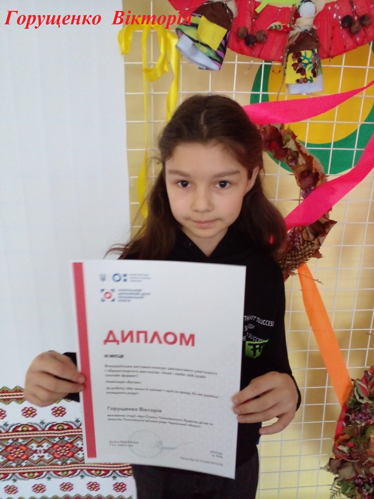 Третє місце у номінації «Малюнок-живопис» вдалося вибороти Вікторії Горущенко, вихованці теж студії «Арт-Стиль», учениці 4-го класу Тальнівської школи №2, за власну роботу «Ми сильні й сміливі і гарні на вроду, бо ми українці – козацького роду!».