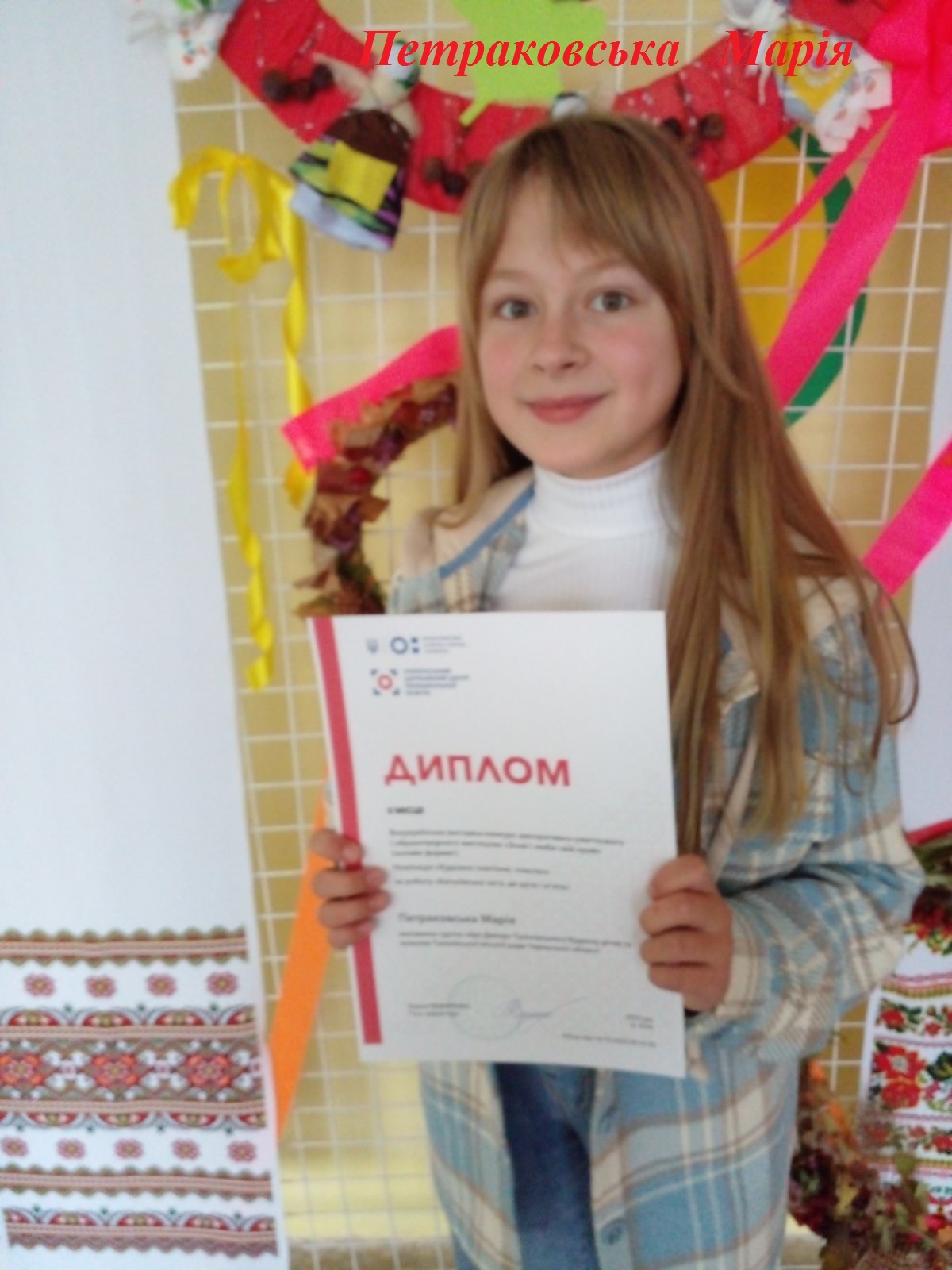 Також друге місце тільки у номінації «Ткацтво» посіла Марія Петраковська за свою роботу «Батьківська хата, де рута і м’ята», вихованка студії «Арт-Стиль», учениця 4-го класу Тальнівської школи №2.