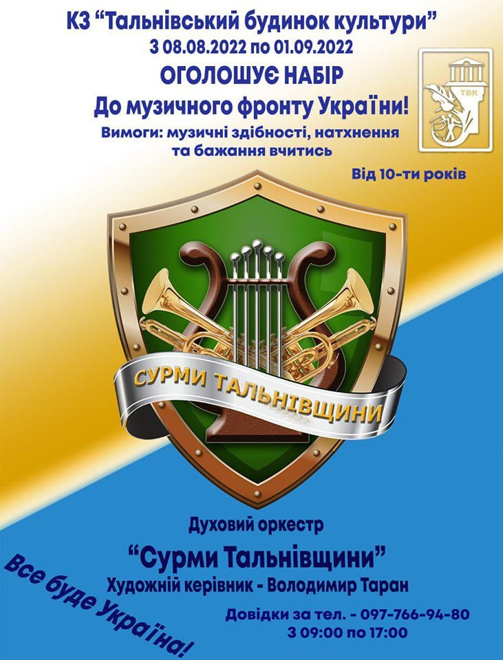 Дітей від 10 років запрошують до духового оркестру «Сурми Тальнівщини». Від маленьких тальнівчан потрібні лише музичні здібності, натхнення та бажання вчитись.
