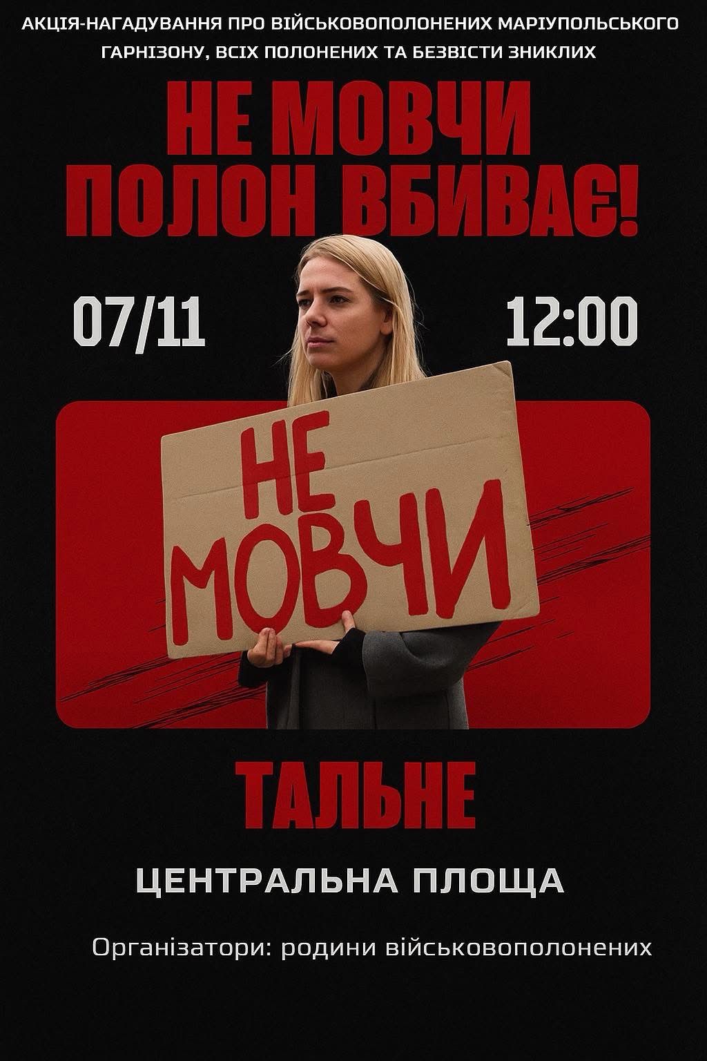 7 листопада 2025 року (п’ятниця) о 12:00 у центрі міста Тальне, біля пам’ятника Героям Небесної Сотні та Захисникам України, відбудеться мирна акція «Не мовчи — полон вбиває».