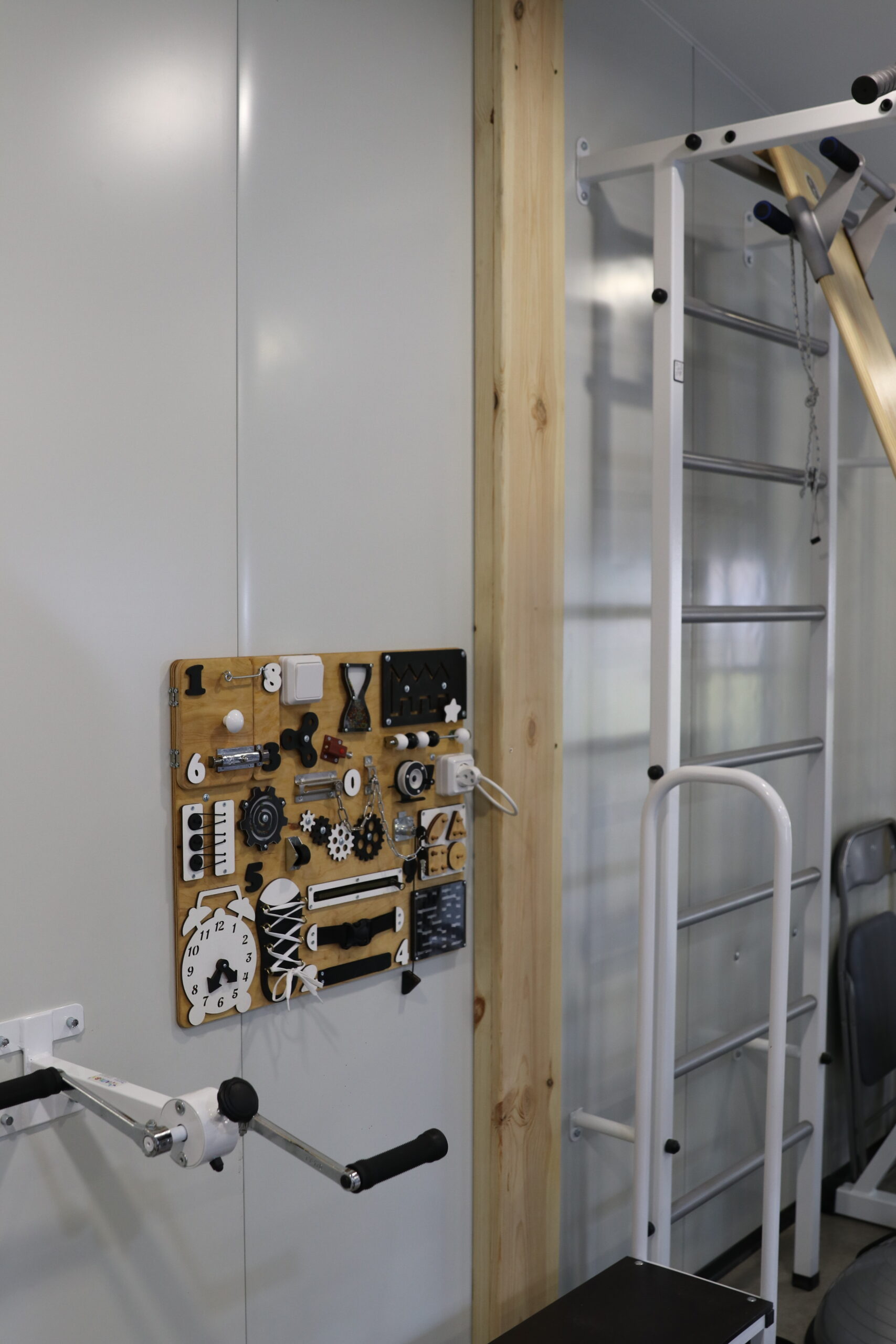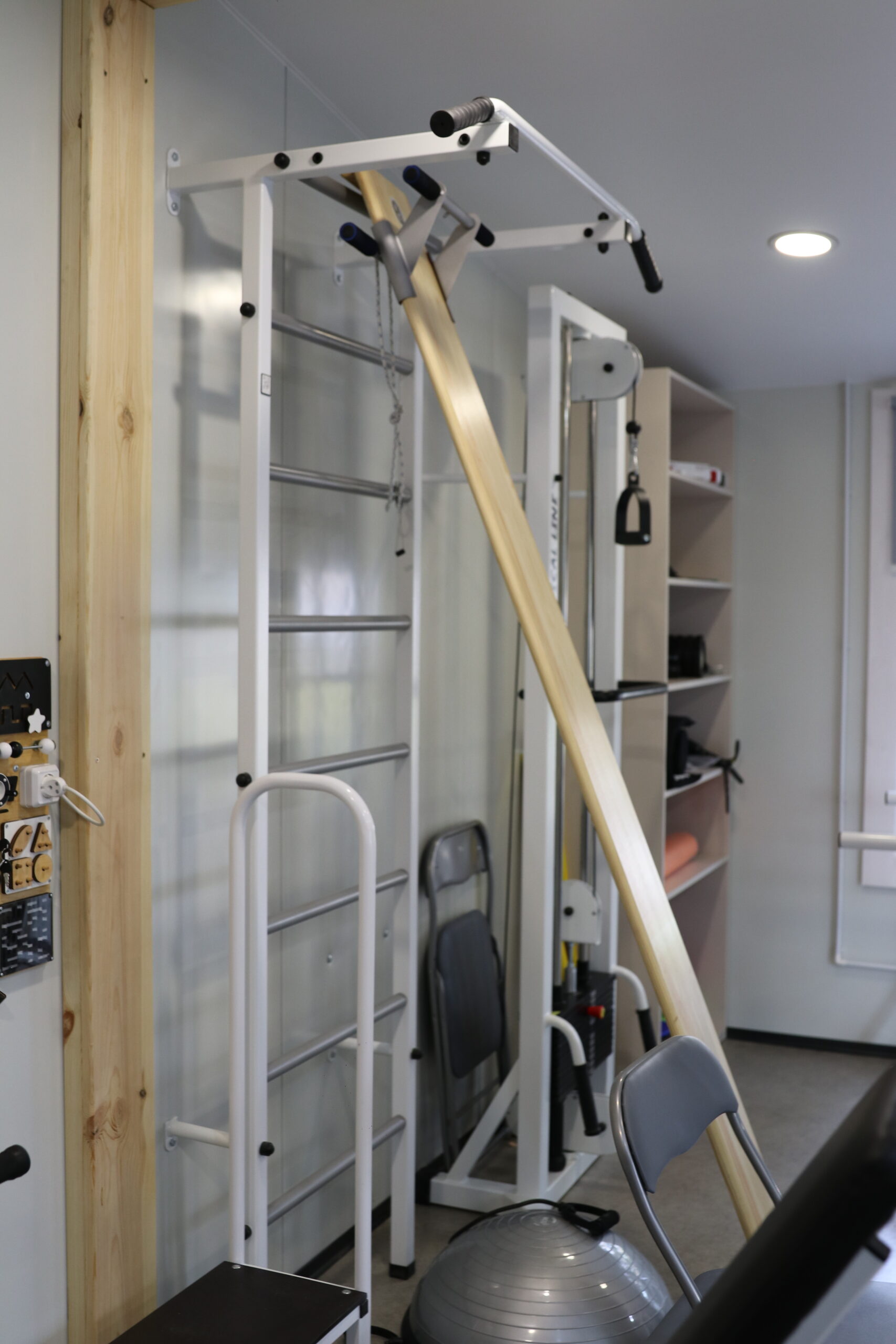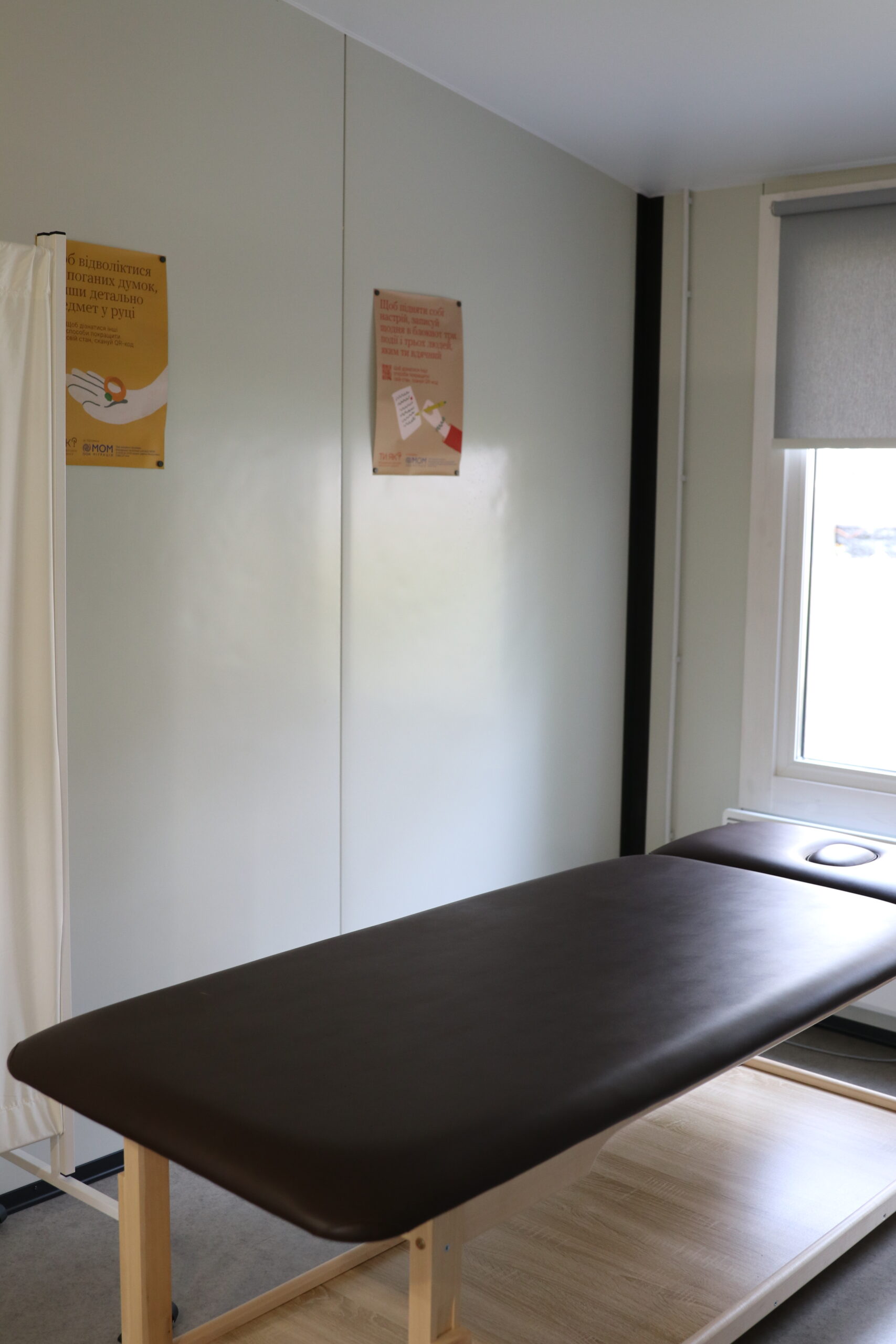 «Це мобільний корпус площею 72 квадратні метри. У ньому враховані всі ДБН-норми щодо інклюзивності. Ми зараз перебуваємо в зоні вітальні, де працює кейс-менеджер – координує запис до лікаря та комунікацію з пацієнтами, підбирає зручний час. Тут діють фізичні терапевти-реабілітологи, зала повністю оснащена сучасним обладнанням. Усі фахівці з Тальнівської лікарні. Це вже дев’ятий такий центр у межах національної мережі. Подібні об’єкти відкриті у Голованівську, Василькові, Хотині. А нещодавно в Богуславі запрацював збільшений модуль на 116 квадратних метрів із залом для групових занять і ергокухнею для ерготерапії».