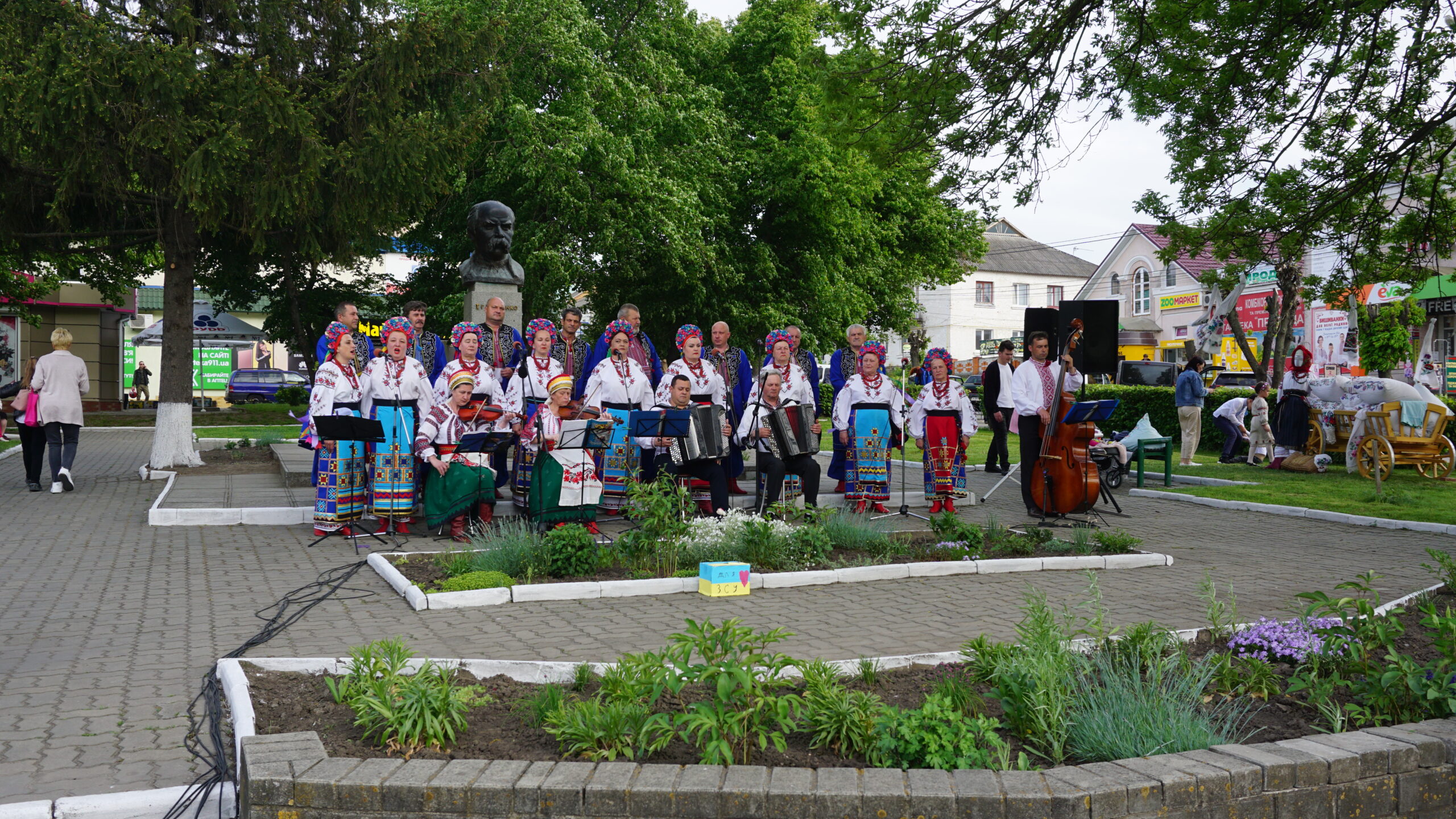 Після показу свято продовжилося. Глядачі слухали виступ двох дівчаток, які неочікувано виявили бажання заспівати акапельно, щоб зібрати у свою скриньку кошти для наших захисників. Тож поки юні артистки виконували пісні «Українська лють» Христини Соловій та «Ой, у лузі червона калина», глядачі мали можливість вкинути у скриньку дівчаток гроші.