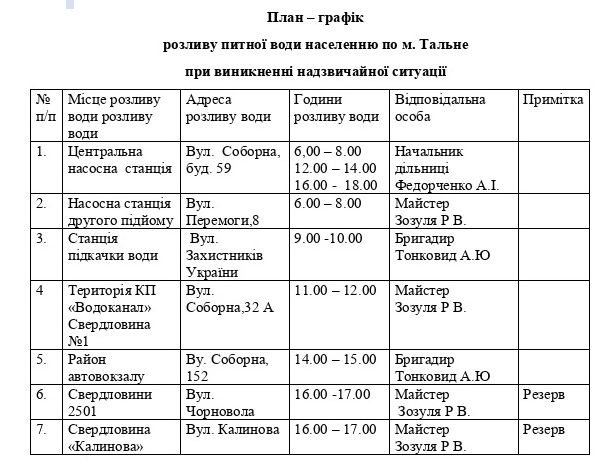 Зважаючи на виникнення екстрених ситуацій, пов’язаних із ворожими атаками енергосистеми нашої країни, на виконання доручення міського голови Василя Сідька від 07.11.2022 в частині розроблення механізму реагування на надзвичайні події в Тальнівській міській територіальній громаді КП «Водоканал» ТМР розробив план-графік розливу питної води населенню по м. Тальне при виникненні надзвичайної ситуації.