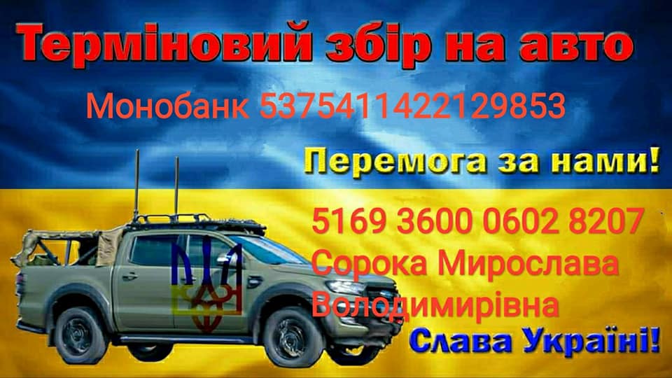 Дружина військового Мирослава розповідає, що попередні дві машини, які були у військових – знищені. І наразі наш захисники лишились транспорту для пересування. Для купівлі нового авто не вистачає близько 120 тисяч гривень, початковою сумою збору була сума 200 тис грн, однак 80 000 уже вдалося зібрати. Також певну суму бійці забезпечать своїми силами.