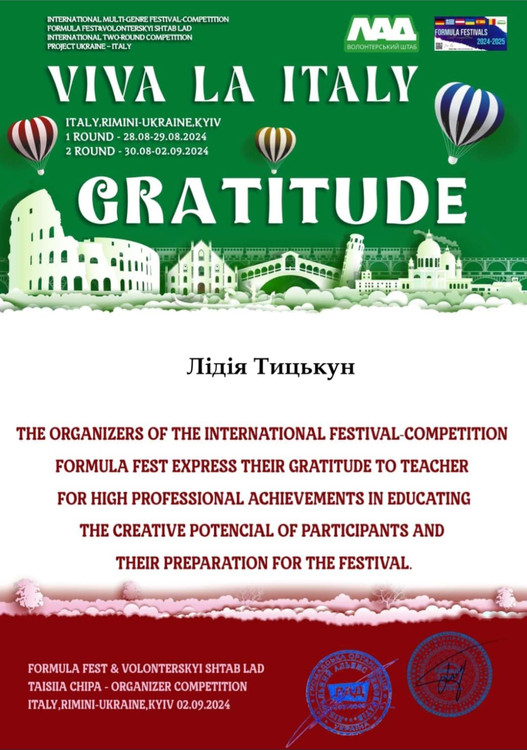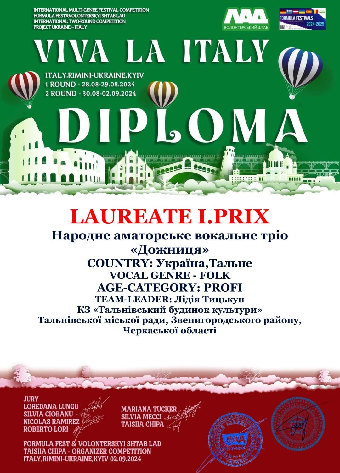 –Ріміні в Італії знаходиться на відстані 2 079,5 кілометрів від нашого мальовничого міста Тальне, транспортом можна доїхати за 23 години 39 хвилин, але це не завадило народному аматорському вокальному тріо «Дожниця» КЗ «Тальнівський будинок культури» взяти участь у дистанційному Міжнародному благодійному двотуровому конкурсі мистецтв VIVA LA ITALY – FORMULA та стали лауреатом І премії, – таку розповідь поміщено у фейсбуці на їхній сторінці.