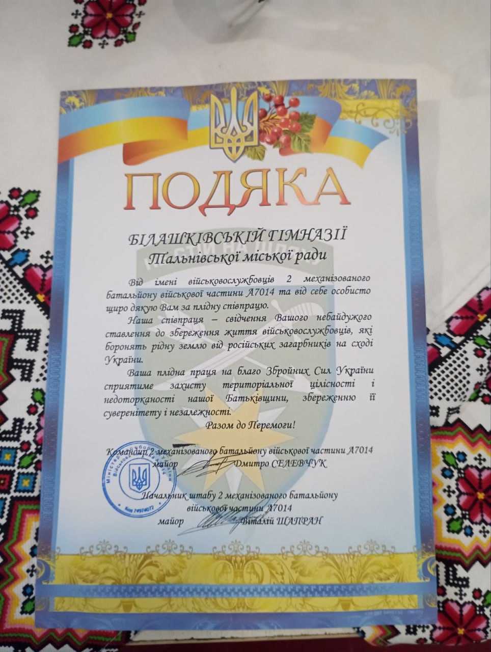 Командир та начальник штабу 2 механізованого батальйону військової частини А7014 від імені військослужбовців та від себе особисто щиро дякують Білашківській гімназії за плідну співпрацю: «Наша співпраця – свідчення Вашого небайдужого ставлення до збереження життя військовослужбовців, які боронять рідну землю від російських загарбників. Ваша плідна праця на благо ЗСУ сприятиме захисту територіальної цілісності й недоторканності нашої батьківщини. Разом до Перемоги!»