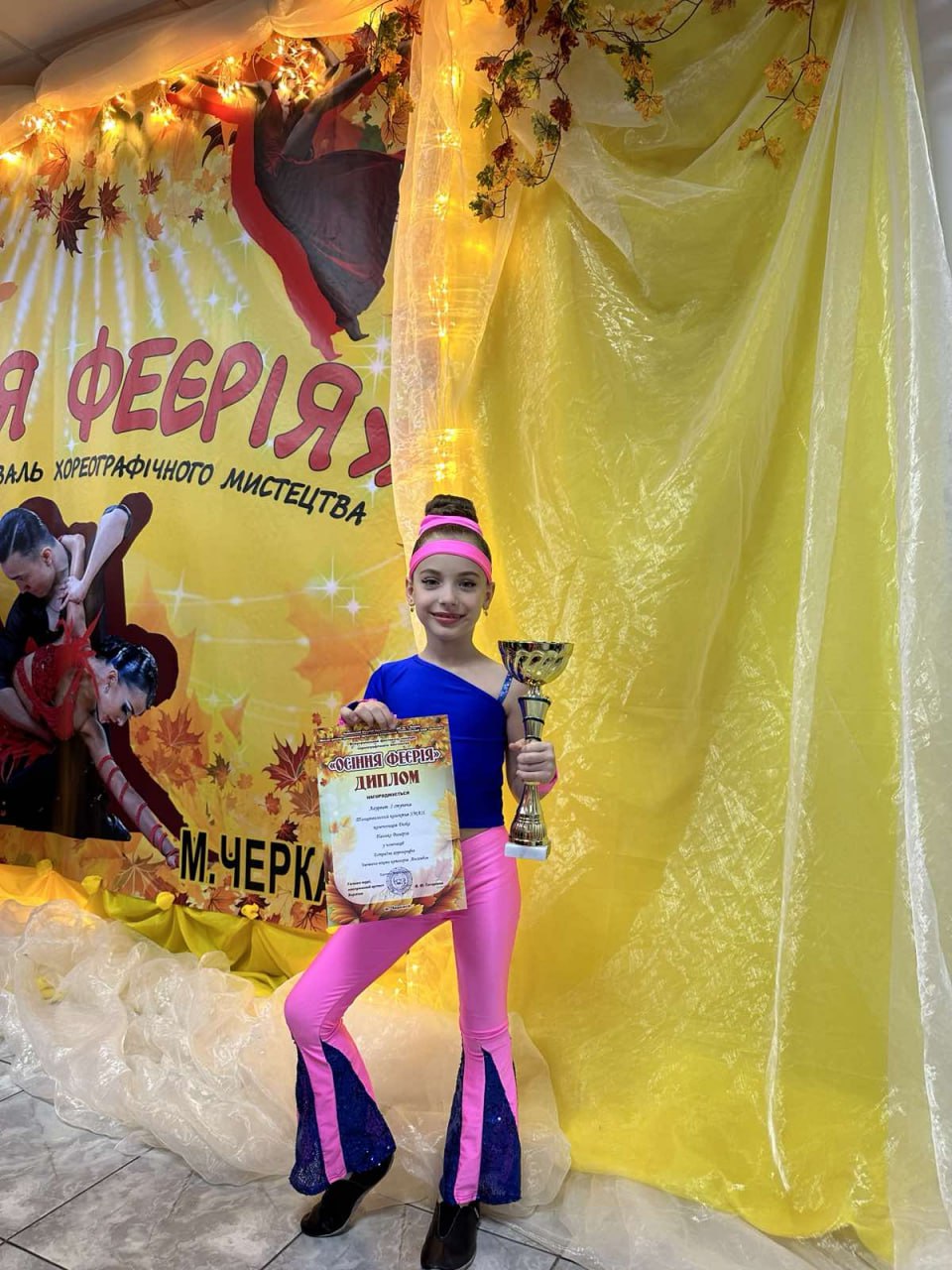 Окрім образотворчого мистецтва, школярка ще й займається спортивно-сучасними танцями. Під керівництвом Каріни Мороз у колективі «Смайл» опановує основи хореографії, бере участь у багатьох заходах і фестивалях: «Травневий дивертисмент», «Осіння феєрія», «Весняний вітер», «Квітнева феєрія» тощо. Танцюристки гурту здобули найвищу нагороду, гран-прі, на міжнародному дистанційному конкурсі в Єгипті.