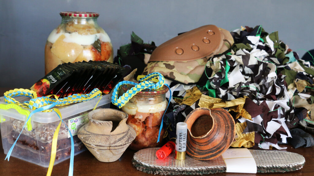 Маріупольці поїхали, а у нас знову плетуться сітки та шиються розгрузки для тероборони, миються банки для каші, ріжеться тканина для кікімор (уже для фронту). До речі, вчора військові забрали 10 сіток, сьогодні – теж 10 сіток і 2 кікімори.