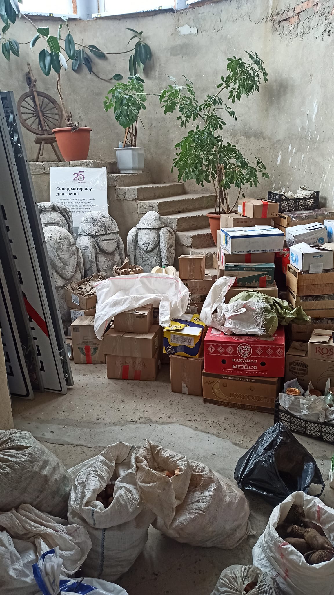 О 12-й приїжджає автівка – восьмеро біженців з Маріуполя зупинилися в Умані і, знайшовши наші контакти, відправили двох з них – Рустама і Валерію, по допомогу. А далі – чим, по-сільському, багаті: картопля, морква, цибуля, консервація, м’ясА, салА, крупи, борошно, молоко, дитячий одяг та взуття…