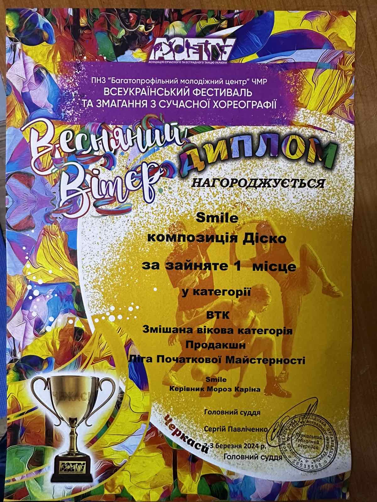 Клуб спортивного танцю «Smile» на базі Тальнівської школи мистецтв, що на Черкащині, побував на Всеукраїнському фестивалі хореографічного мистецтва та Всеукраїнському Чемпіонаті з сучасних танців «Весняний вітер» в області.