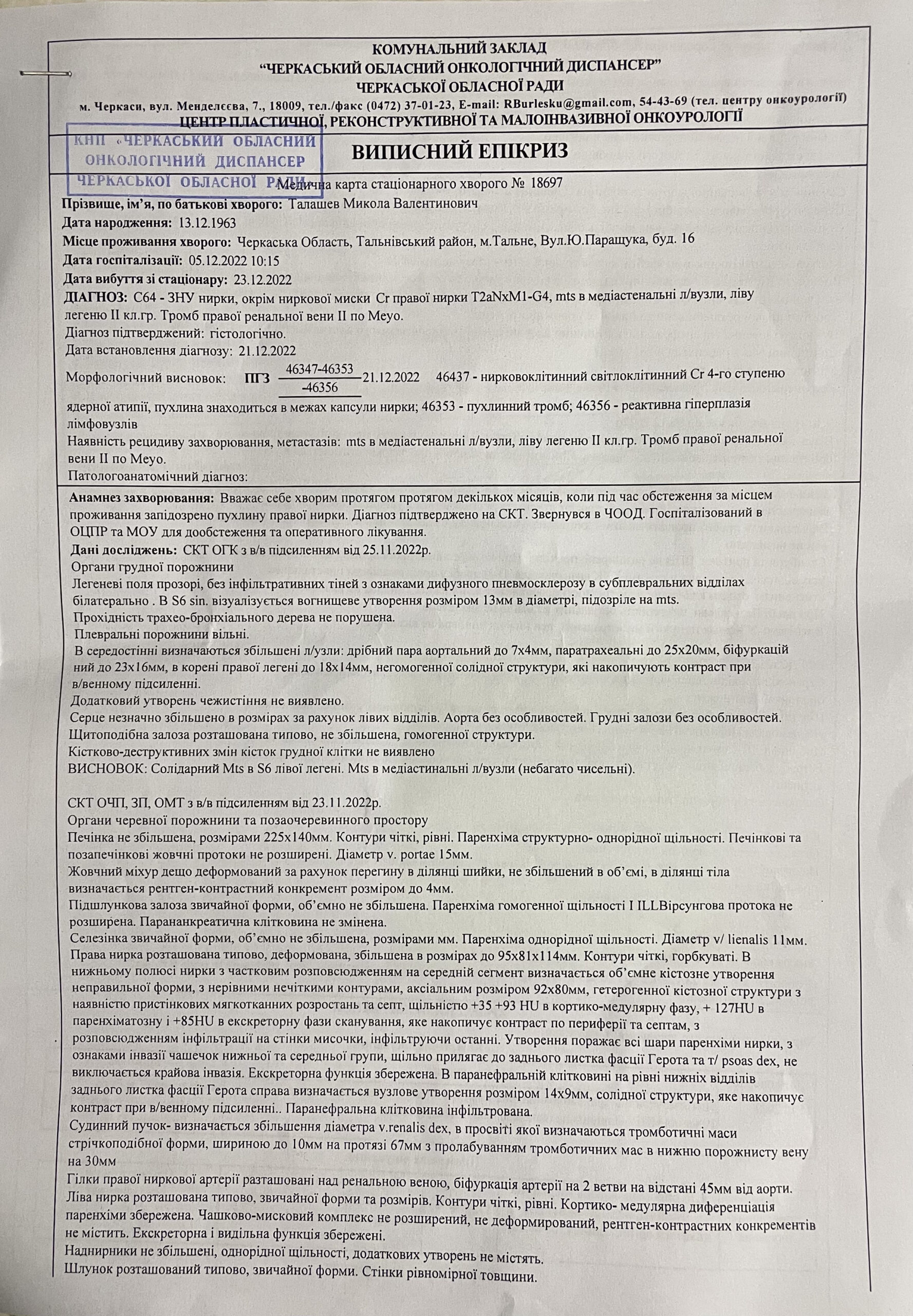 Понад тиждень тому ми писали про те, що 59-річному Миколі Талашеву з Тального на Черкащині потрібна допомога. У чоловіка діагностували рак нирки на 4-й стадії. Врятувати чоловіка може тривале та дороговартісне лікування. Миколі Талашеву, як повідомляли нам рідні, вже зробили операцію, на черзі – кілька курсів хіміотерапії, комплексний прийом дорогих таблеток. Тож донька зверталася до всіх небайдужих людей, аби допомогли зібрати 200 тисяч гривень на лікування батька. Сьогодні дружина чоловіка Олена Талашева повідомила нам, що ця сума вже зібрана: