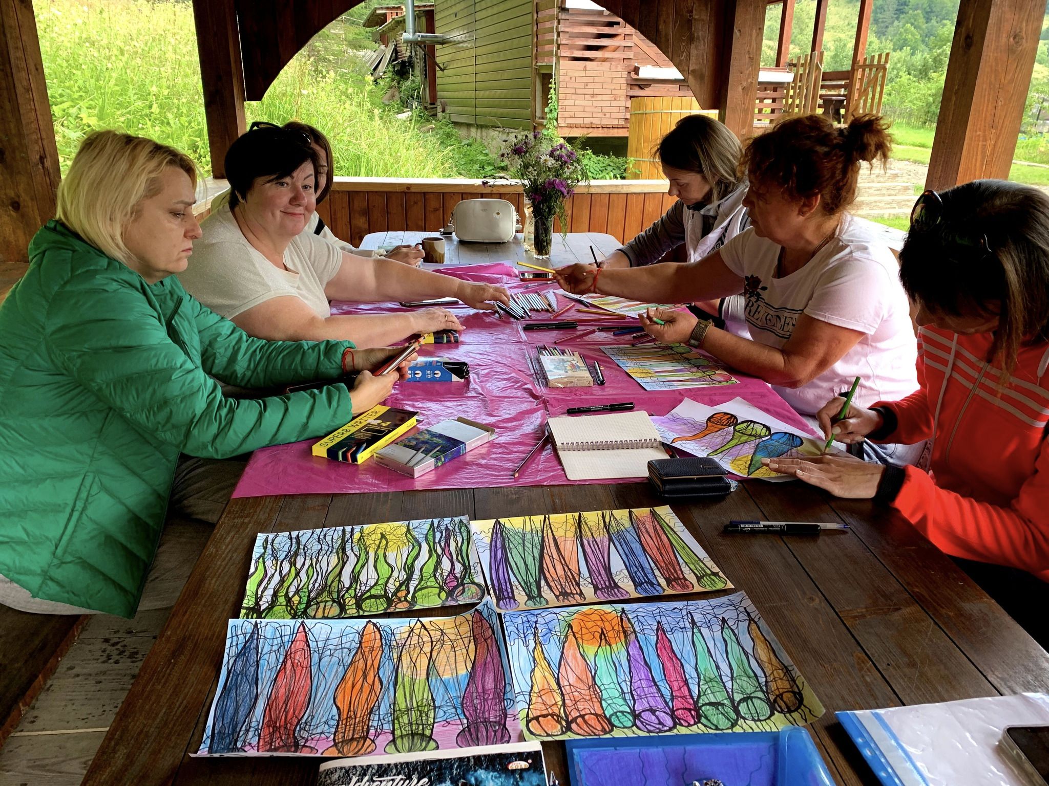 «Я склала програму таким чином, щоб люди мали можливість гармонійно себе пропрацювати та відновитися на рівні тіла, розуму й душі, – розповідає Тетяна. – Заняття йогою ми чергували з практиками глибокого розслаблення та відновлення, мандрівками до місць сили (Угорських Скель, старовинної місцевої церкви), збирали цілющі трави, працювали з метафорично-асоціативними картами, родом, займались нейрографікою, малюванням, спогляданням природи, фотографуванням (окремий вид арттерапії), практикували мовчання, щоб почути себе з середини та дати можливість внутрішнім процесам згармонізуватися. А ще ми чудово проводили час в приємному жіночому колі: спілкувались, купались у чані серед зелені Карпат, співали народні пісні біля живого вогнища».