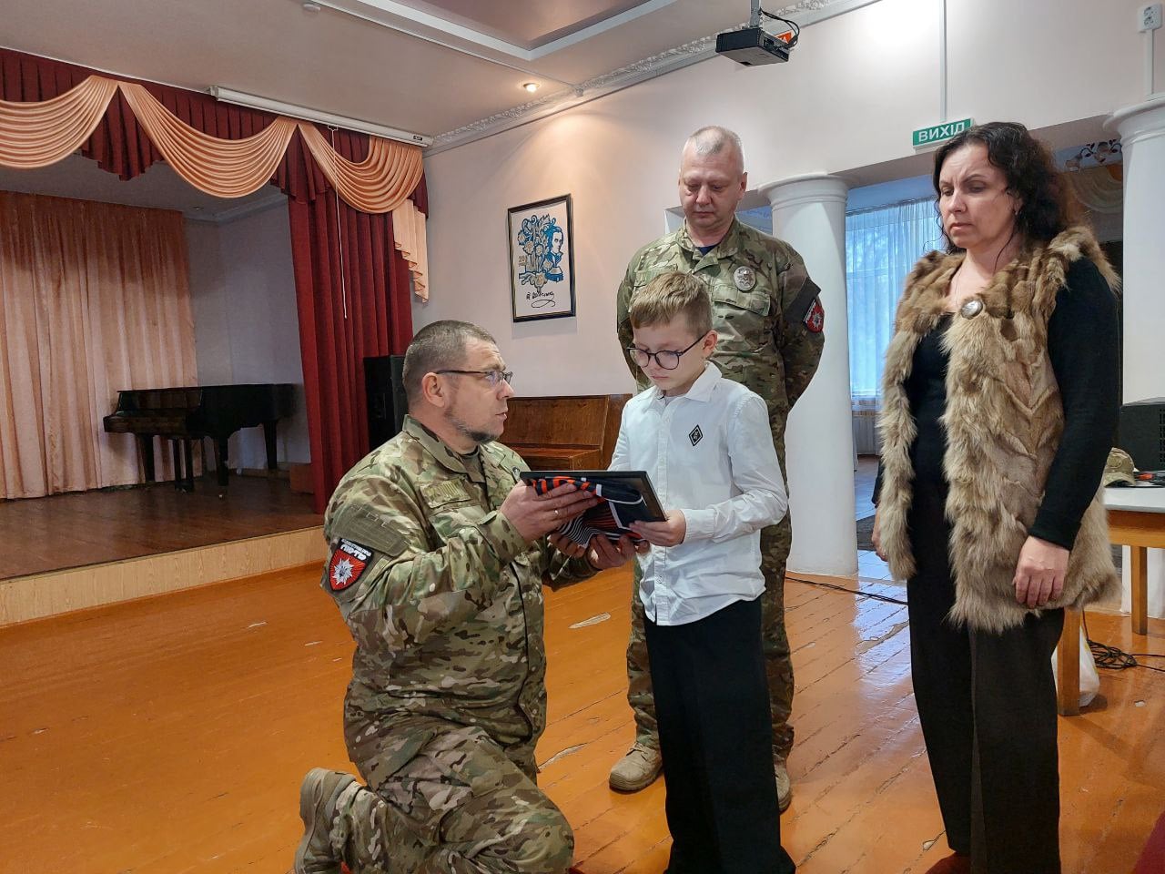 «Вони зустрілися з сином полеглого захисника Богданом Гаркавенком, щоб передати найвищі символи шани й пам’яті: «Комбатантський хрест» – нагороду його батька, вручений посмертно, а також шеврони та прапор бригади «Лють», – інформують у ліцеї. – Це була надзвичайно щира та зворушлива зустріч, на якій учні та педагоги ліцею вшанували пам’ять Героя, схиливши голови перед мужністю та жертовністю українських воїнів».