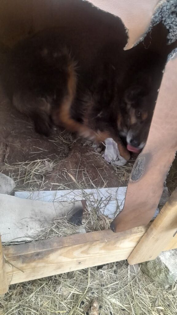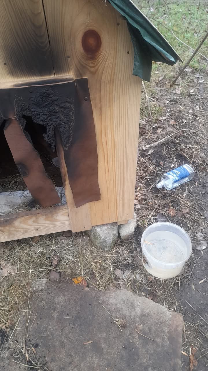 Трапилось це у середмісті. Собака безпритульна. Однак волонтери попіклувались забезпечити її недешевим житлом. Це не сподобалось, очевидно, окремим мешканцям, які вважають, що коли тварина голодна й холодна, то її легше позбавитись. Така позиція хибна і негуманна. Хибна тому, що голодні тварини все рівно животітимуть, харчуючись травою, відходами та гризунами, але будуть менш соціалізованими та більш агресивними. А негуманна, бо негуманна в принципі.